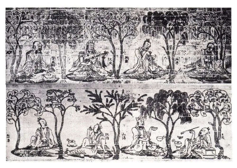 《竹林七贤与荣启期砖画》是在南京西善桥中所发掘的。它来自六朝时期,长240cm、高88cm,由200多块古墓砖组成,分为两幅,由魏晋名士竹林七贤:嵇康、阮籍、山涛、王戎、向秀、刘伶、阮咸和春秋时期的著名隐士荣启期组成。是我国现存最早的竹林七贤人物组图。