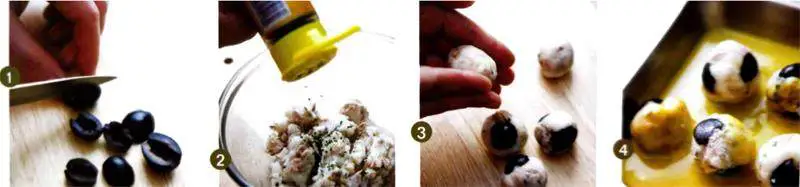 3.用金枪鱼裹住黑橄榄后,捏成圆形。