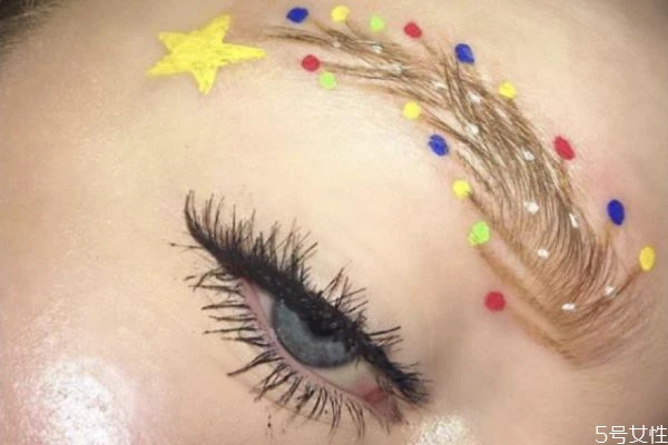 俏皮圣诞妆的特点是像圣诞树一样的眉毛,化法是:底妆上好后,用睫毛胶将眉毛分成向上或向下的形状,然后在每缕眉毛的尾部粘上一个圆形亮片,亮片可以选择不同颜色的,其他的妆容就按照平时的化法就可以。