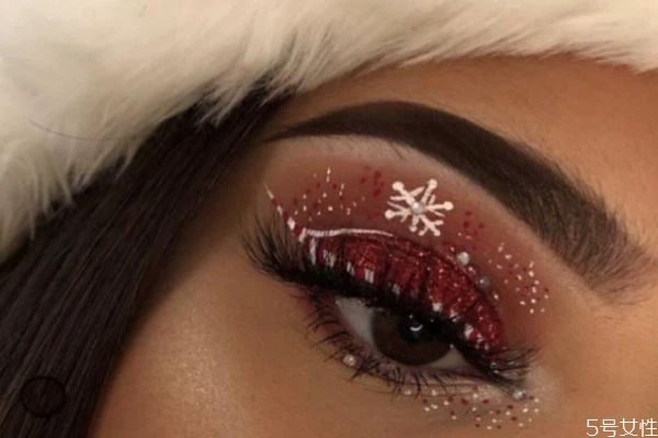 圣诞节适合涂什么样的眼影呢?当然是暖色系的红金色了,颜色抢眼,一眼望过去就是天使好吗!这个颜色比一般粉紫色要更不挑人一点,就是单眼皮涂也很妩媚。想要blibgbling一点的话可以试试这样带亮片的款,更符合节日气息,闭眼睛的时候仿佛有星河在流动,也是超级美呢!在眼睛周围贴一些小亮片的话会更抢镜,今年圣诞焦点说不定就是你呢!
