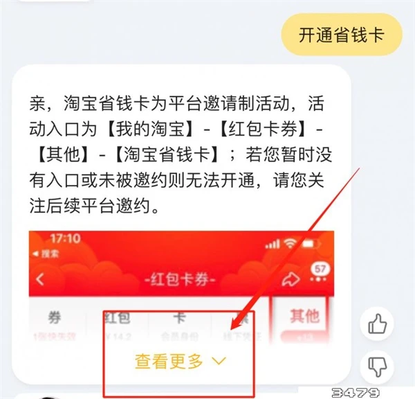 2、在【客服小蜜】页面点击下方【开通省钱卡】快捷选项,也可在对话框内输入【开通省钱卡】;