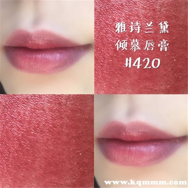 温婉的豆沙色,超级适合日常,雅诗兰黛420这款可以说是豆沙色中的经典色号了,上唇效果非常自然,而且还不怎么挑皮,一般黄黑皮肤的妹子选带橘调的会比较适合,然而这款带着淡淡紫色的豆沙色也能完美衬托,这就是很神奇的地方了。