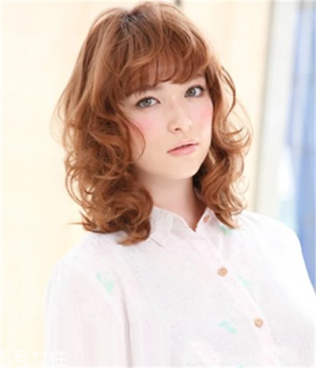 如果妹纸你的脸型有点长的话,可以剪个齐刘海发型,修颜效果棒棒哒,微卷的烫发,白皙的脸蛋,时尚气质突显。