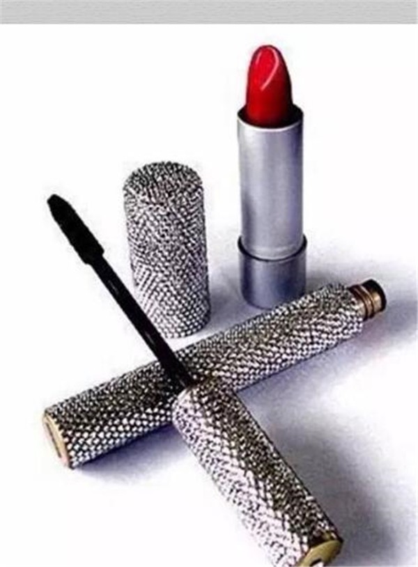 这是唇膏睫毛膏套装,口红与睫毛膏的外壳都是18k黄金制作,口红和唇膏外壳上各镶嵌了1200颗粉钻,和2500颗蓝钻,一套价格就是1400万美元,折合人民币9000多万,买这样一套口红套装,都够买好几套房子了。