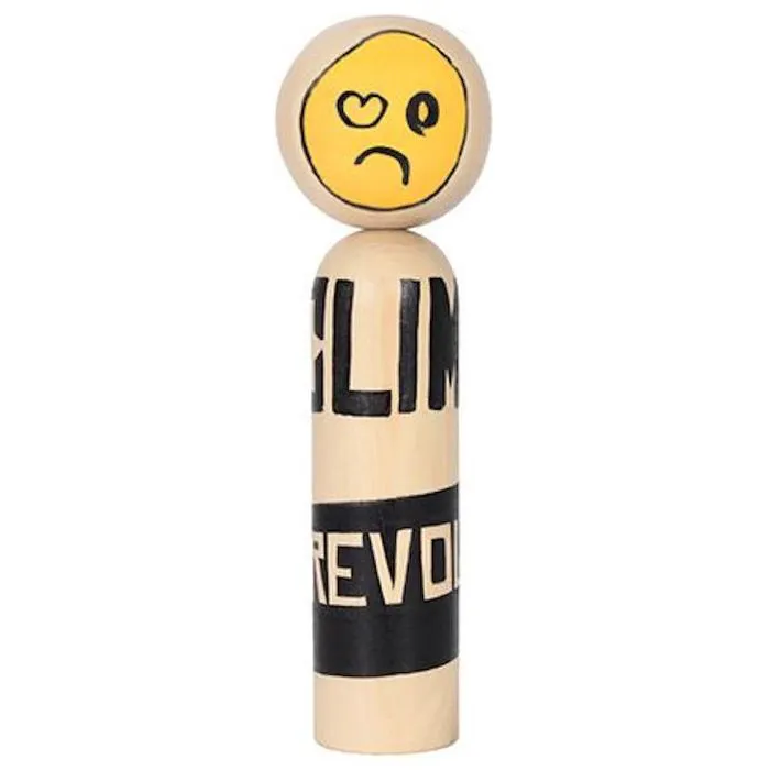 但简单并不意味着粗制滥造。在Vivienne Westwood的创作思路中,“黄色哭脸”代表战争,“粉色爱心”代表和平,一体两面表现着这两个对立的事物实际上是可以十分轻易地相互转换。而“木芥子人偶”上写着的“revolution”字母,则十分鲜明地彰显了她一以贯之的朋克变革精神。