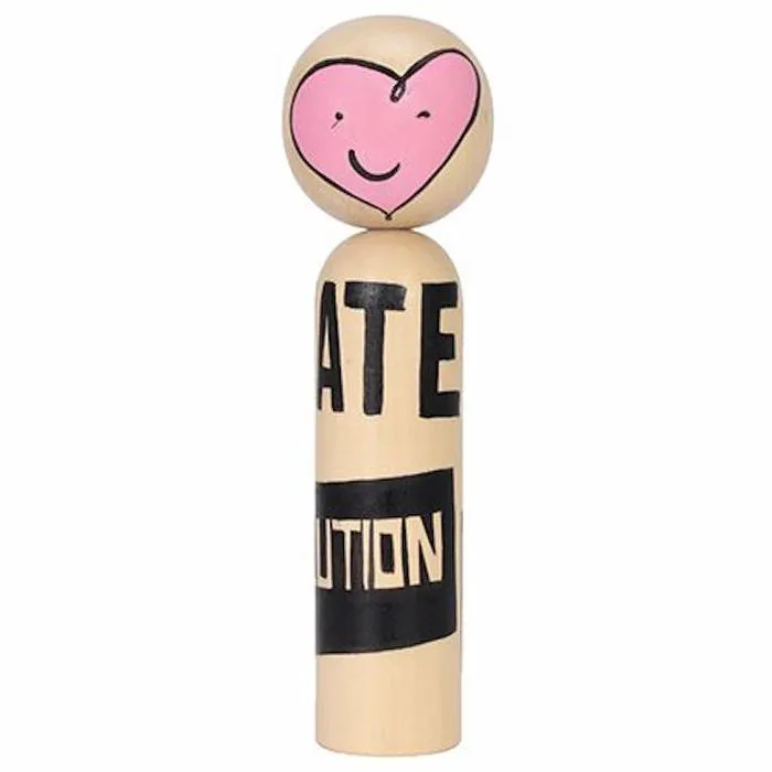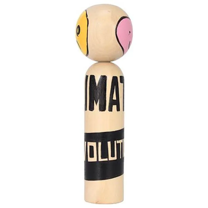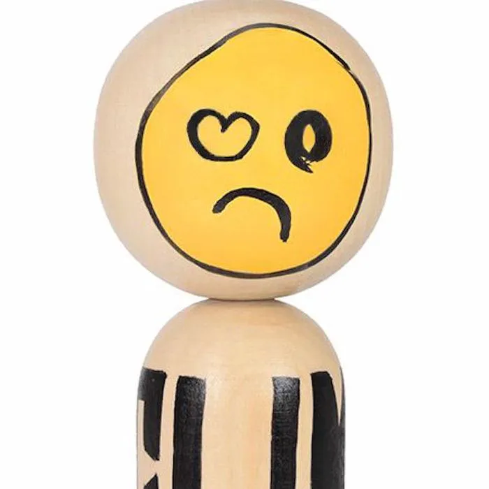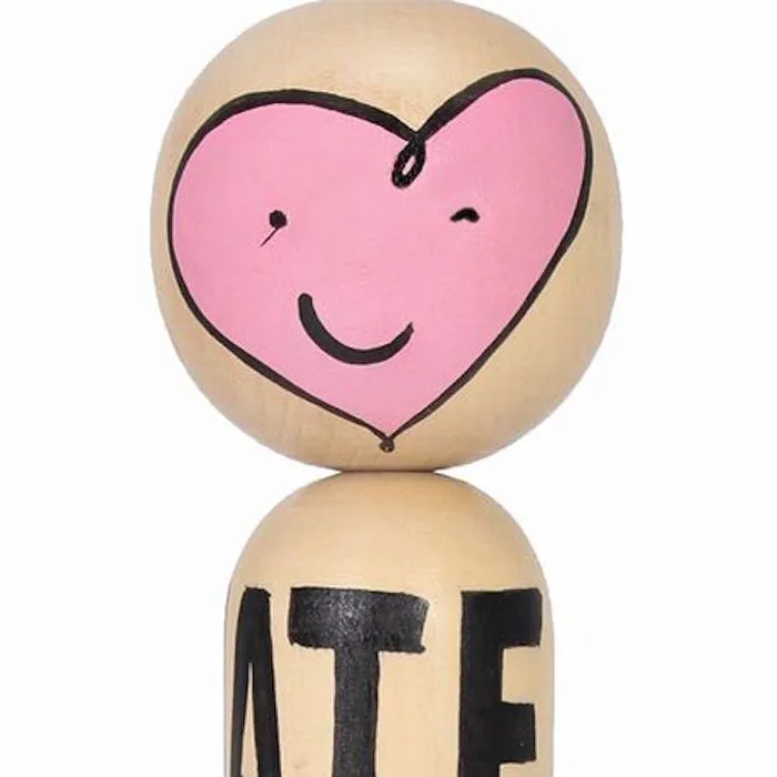 到了Vivienne Westwood手里,这个原本可爱的娃娃变得有些朋克起来。在近日与日本盛冈五叶社传统木匠合作的“木芥子玩偶”系列中,Vivienne Westwood创造的玩偶只剩下光秃秃的木料组合,一面粉色爱心、一面黄色哭脸成为最显眼之处。