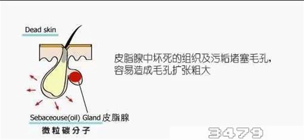 成因:毛孔开口堵塞,与毛孔内的皮脂互相混合而撑大