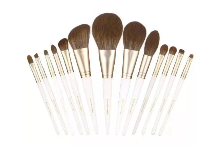 这套刷子一共14支,其中13支的材质都是提纯细光锋的羊毛,另一只是黄狼尾毛,都是动物毛里质感柔软,上妆素质比较好的材质。