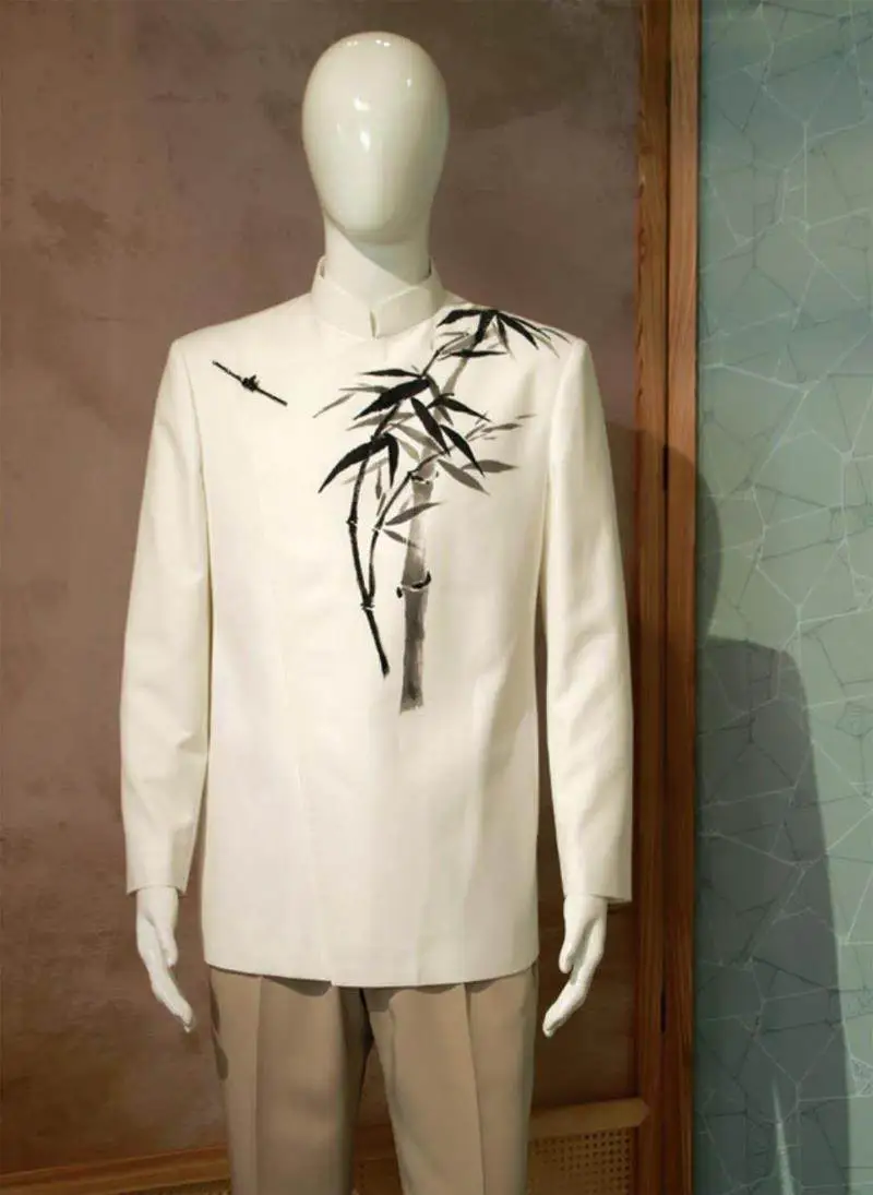 “竹影”新中式男装上衣由北京一商集团有限责任公司旗下的北京红都集团有限公司(以下简称“红都集团”)研发中心职工蔡晓晶设计。该作品以手绘墨竹图案为背景,斜门襟的设计不仅打破了中式传统的对称设计,还与立领相融合,使得服装在保持传统韵味的同时,更具有现代时尚感。在材质的选择上,延续了红都品牌一贯的高品质标准,使服装的版型更加贴合人体工学,线条流畅且富有现代感。精致的纽扣、细腻的缝线以及独特的剪裁工艺在细节之处彰显匠心,让传统服饰焕发出新的活力。