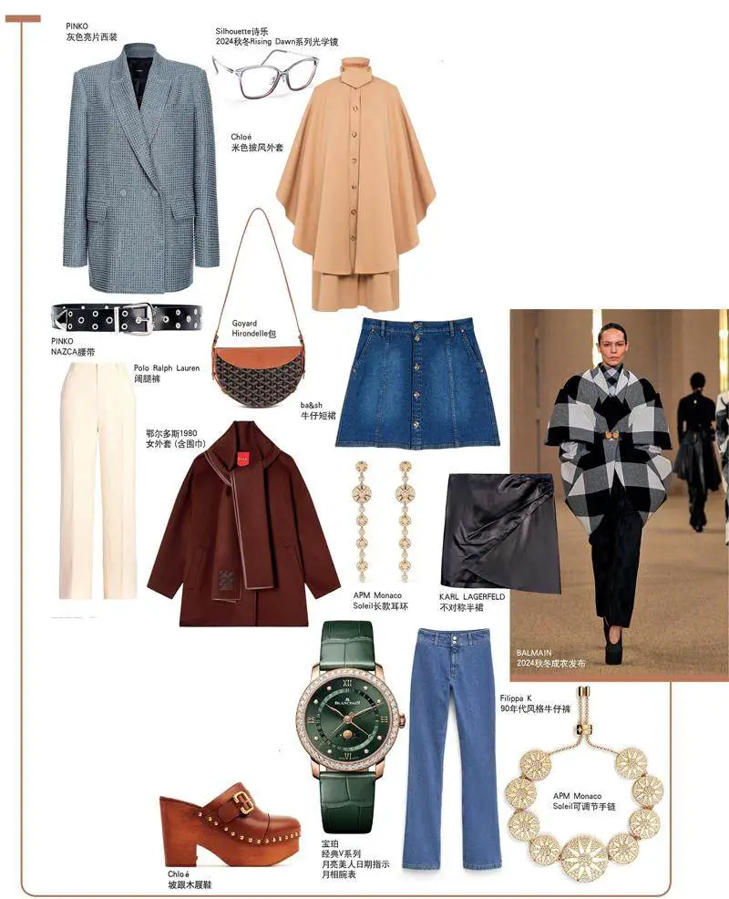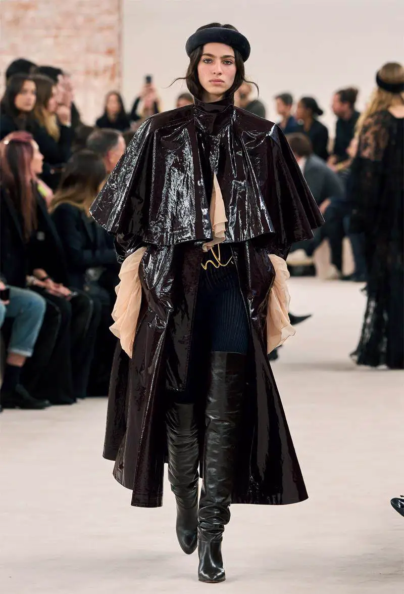 廓形外套作为2024秋冬时装周T台上的亮点之一,各展风采,独具魅力。本季它们打破了常见款的单薄,更具有层次和立体感,剪裁突出,尤其体现在风衣和大衣之上。其中在Balmain 2024秋冬系列中,从风衣到皮衣,再到夹克套装,几乎都采用宽大的肩部设计,沿袭了设计师Olivier Rousteing利落的廓形风格,以展现成熟女性的个性与气势。与此同时,Schiaparelli本季在保留经典元素的基础上,更加注重实用属性。其标志性的宽肩窄腰夹克大量涌现,采用皮革压花工艺制作出鳄鱼皮纹理,并故意放大以形成夸张的视觉效果。