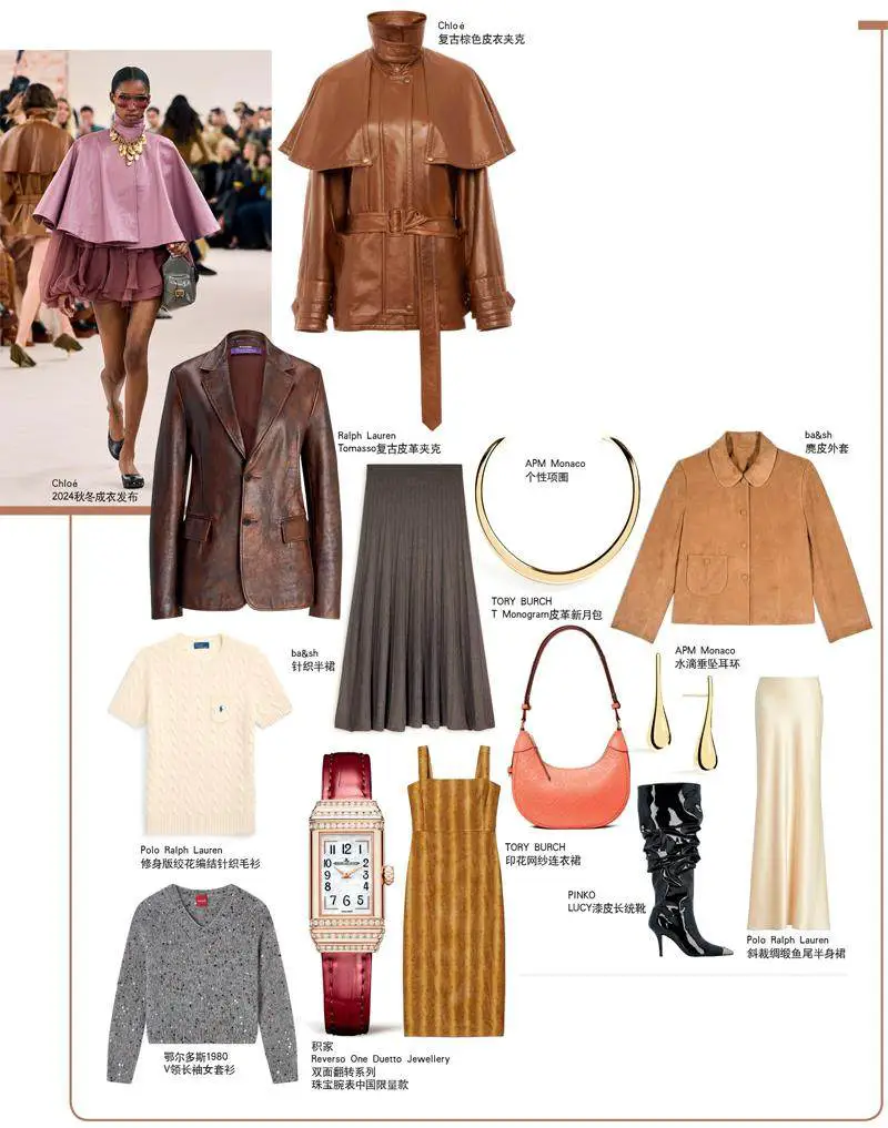 充满质感与力量的皮革,每年皆在时尚圈的T台上占据显赫地位。本季皮革以多样化的风格呈现,巧妙融合了职场与户外的生活方式,通过精致的工艺细节和丰富的纹理材质,成功打破了传统皮革给我们的固有印象。在Ferragamo 2024秋冬系列中,创意总监Maximilian Davis巧妙地将1920年代制服与渔民工作服中常见的皮革外套元素融入本季时装设计之中。这些皮革外套采用无衬里设计,塑造出宽松的版型,完美平衡了休闲风格与时髦气场,充分展现了Ferragamo自由表达的随性态度。而作为曾深受嬉皮士喜爱的麂皮,本季以温暖柔和的触感和自然磨损的做旧痕迹为特色,通过染色和后工艺处理等手法,打造出了富有个性的浪漫造型。如Miu Miu 2024秋冬系列,便以做旧麂皮面料打造出复古都市的摩登感,再配以华丽的钉珠装饰,带来了低调奢华感,成功打造了浪漫的实用休闲造型。