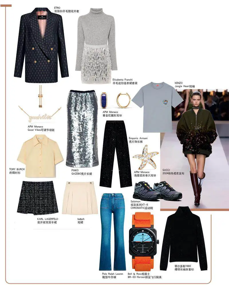 流光溢彩的亮片,以其蓬勃而持久的生命力,一次又一次地征服了时尚界。特别是随着时尚圈的“复古回潮”,亮片元素以其独特的材质与风格,频繁受到各大品牌的青睐。在Gucci 2024年秋冬秀场中,设计师Sabato De Sarno摒弃了品牌以往的极繁设计,巧妙地将华丽、复古的亮片元素融入多件单品之中。由大小不一的亮片渐变组合的挂脖连衣裙、亮片从衣角蔓延向上呈“生长”的大衣、将银丝编织进纱线里的针织套装……高级感的色彩闪耀着轻熟的流光感,让这个秋冬华丽质感。