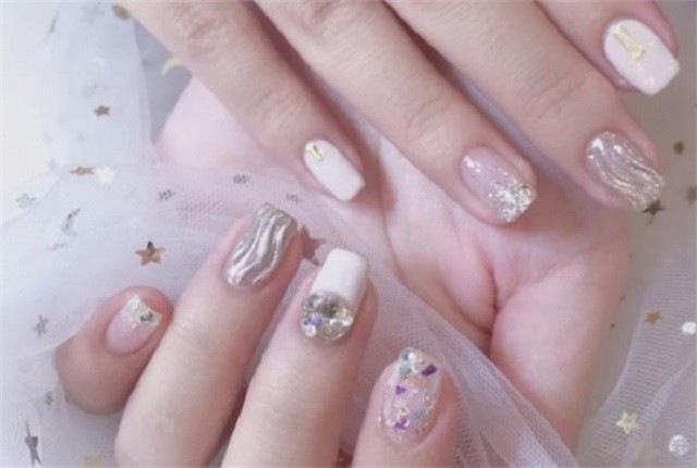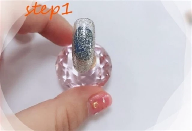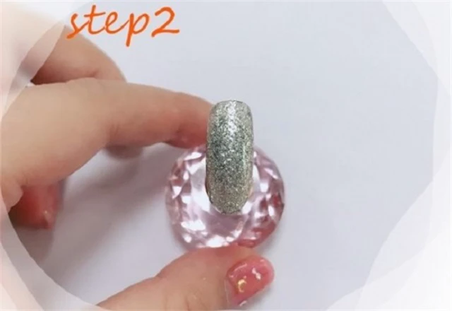 2、为了让颜色更饱满,可以再多刷一次银色亮片甲油胶然后照灯处理。再刷上一层加固胶让甲面看起来更平整更美观,接着进行照灯处理。