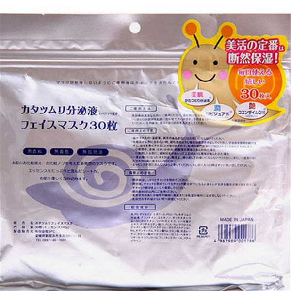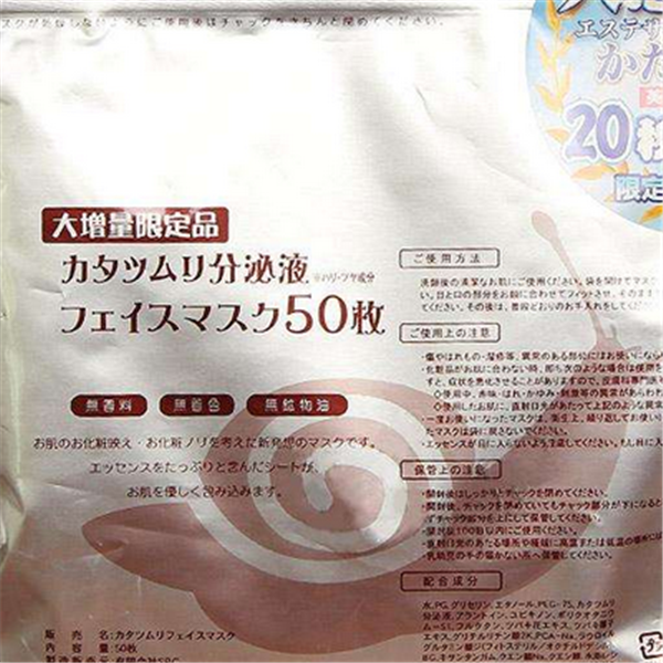 日本SPC蜗牛面膜。50片的增量装,自带封口条。话说一般买东西都喜欢大包装,一是划算,二是可以一家人一起用,三是囤起有种富足感。开封后没什么味道,真心感觉无香精。厚厚的一叠本来以为不好拿出来,结果每张对折起来,非常容易就拿出来了。记得立马拉上封口条哦。纸感很柔软贴肤,10来分钟之后取下脸上不会特别滑,更加证明了无添加。脸像喝饱了水,就性价比来说整体90分。