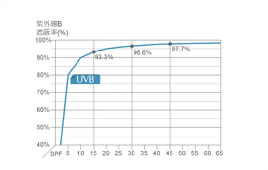 对比SPF值为50的防晒产品,SPF 50 =(50-1)/50*100%=98%,即只有2%的UVB能照射到皮肤上;
