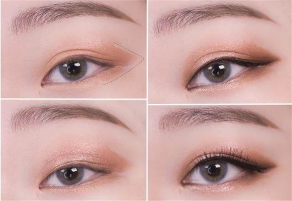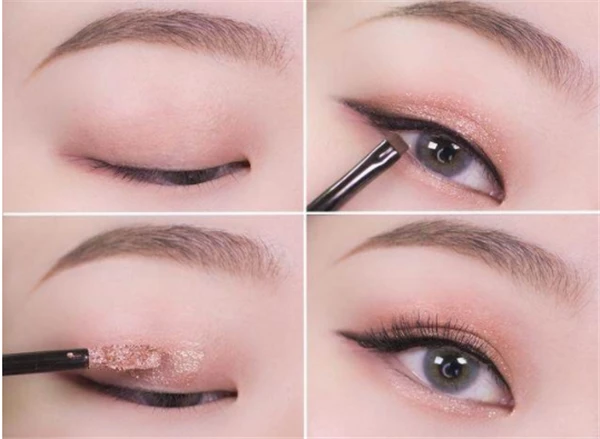 眼妆示范二:step01:用玫瑰色眼影做打底色涂抹在整个眼睑处。 step02:先取适量玫瑰金色液体眼影涂抹在上眼睑。 step03:用黑色眼线膏描画眼线,然后用NARS单色眼影#巧克力色晕染眼线。 Ending:眼妆完成,淡妆好像更好看。