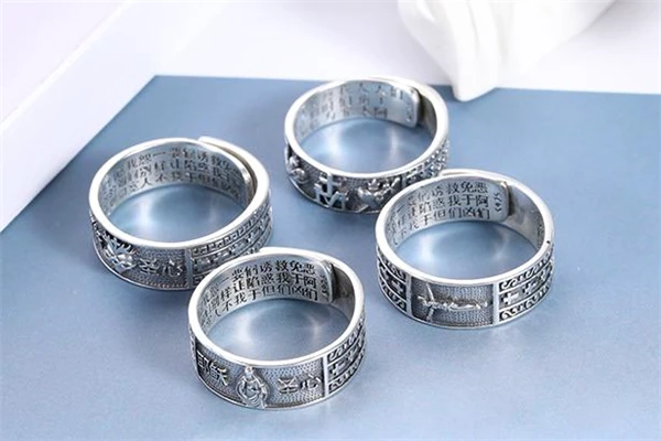 塔冷通戒指做工精细,宽版工艺,925造旧工艺,内圈心经字体清晰,不挑手,胖瘦都能戴。里面的刻字也是很用心了,每个字都非常清楚,另外这个戒指环的大小可以收缩,所以这五个手指都是可以随意带的,无论是中指,食指还是无名指都行,也比较好搭配衣服,酷酷的,有质感。