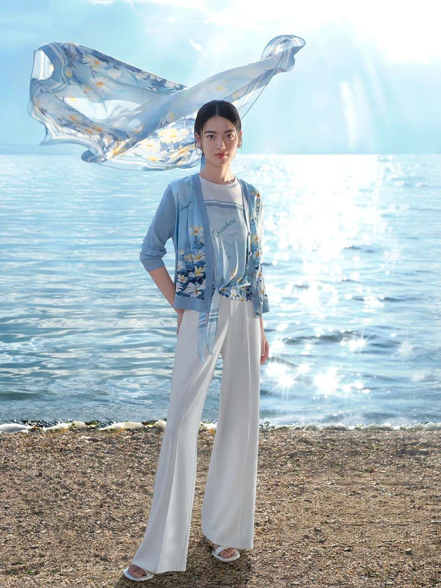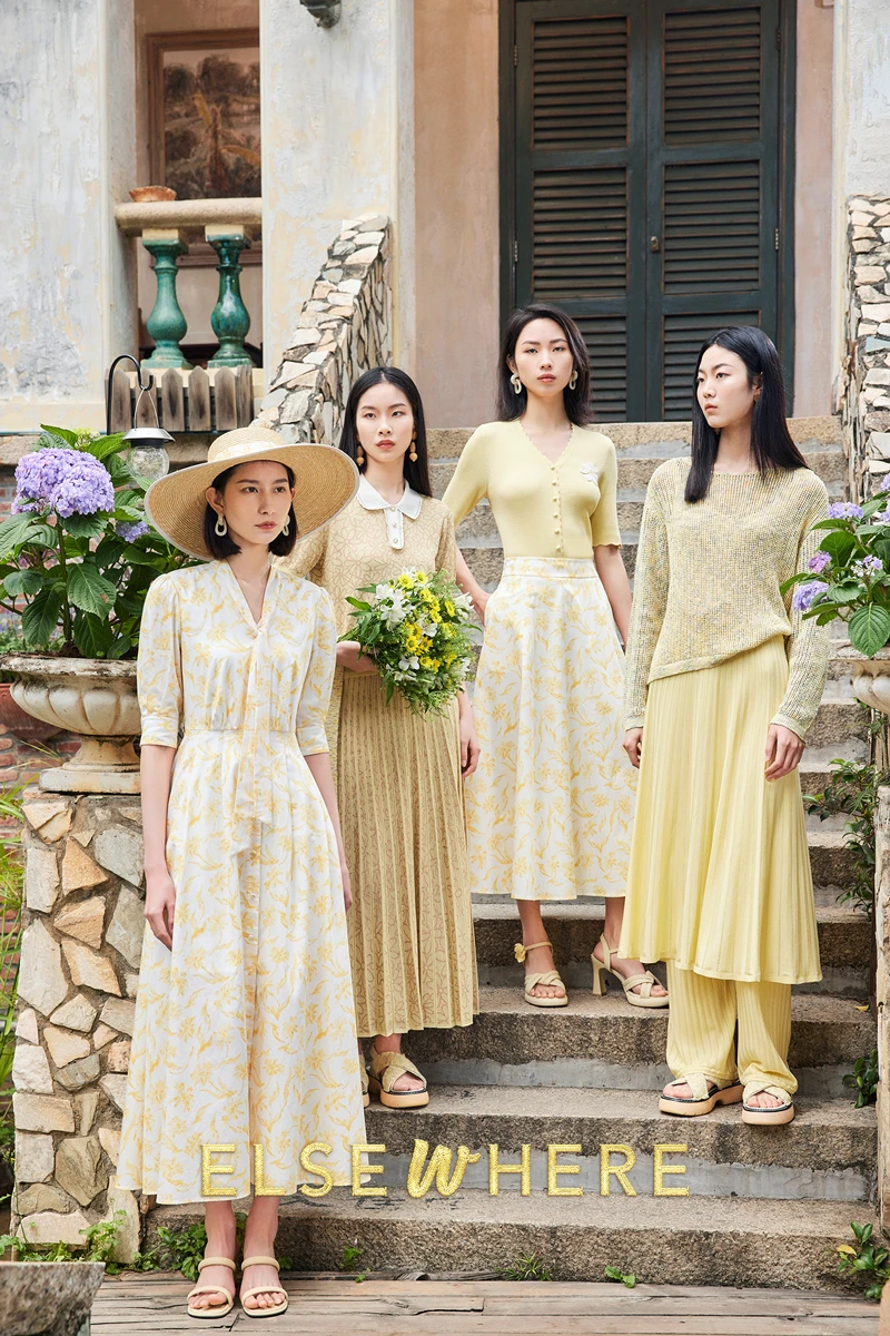 以莫奈和卡米尔的爱情为灵感, ELSEWHERE品牌色:珂思黄随之诞生,全系列以品牌色珂思黄为主,倡导爱与温暖,在山海间探寻挚爱之光。系列强调色彩的统一,搭配修身剪裁与柔软针织面料的结合,在塑造女性着装造型线条美感的同时,融入雏菊花的点缀诠释都市女性对诗和远方的向往。