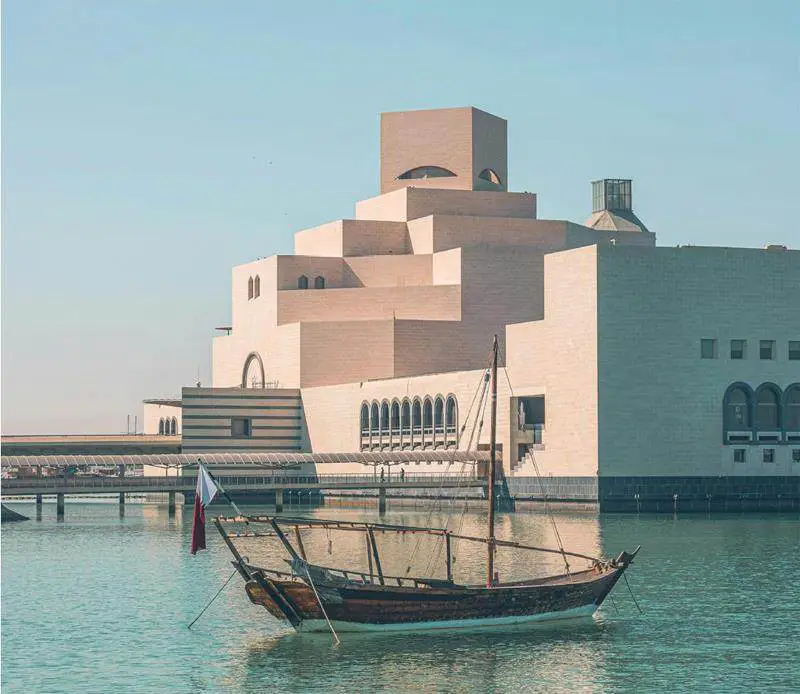 在多哈,还能欣赏到另一位普利兹克建筑奖得主——贝聿铭设计的伊斯兰艺术博物馆,博物馆于2008年落成启用,当时贝老已经91岁高龄,是他建筑人生的收官之作。伊斯兰艺术博物馆的选址是由贝聿铭决定的,他拒绝原本在滨海大道上的提议,提出在多哈滨海大道的南面离岸60米(197英尺)的地方建一座人工岛。这座新的“C”形半岛自成一体,既不受北边波斯湾的影响,又和东部千篇一律的工业大楼分隔开来。当我们走向博物馆时,整齐排列的棕榈树与渐层上升的小瀑布坡道,一种逆流而上的希望逐渐升起。行程结束,搭“名胜世界壹号”邮轮安排的大巴返回码头,车道两边的“棕榈叶”形路灯蜿蜒至远方,延续今日所见的文化艺术瑰宝……