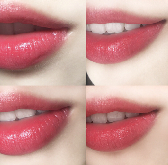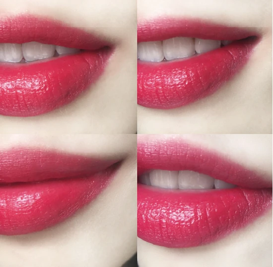 72比40就年轻很多,是个元气的红色,和细管10有点像,但着色更加饱和扎实。膏体也有细金闪,但是上嘴不太明显,红色不挑皮,四级也都适合,算是个不会出错的颜色吧。