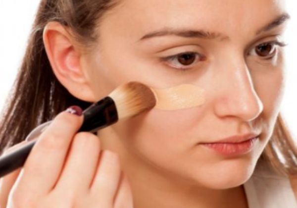 第三步 然后将黄豆大小的粉底液点涂在面部,用粉底刷或海绵均匀拍开。
