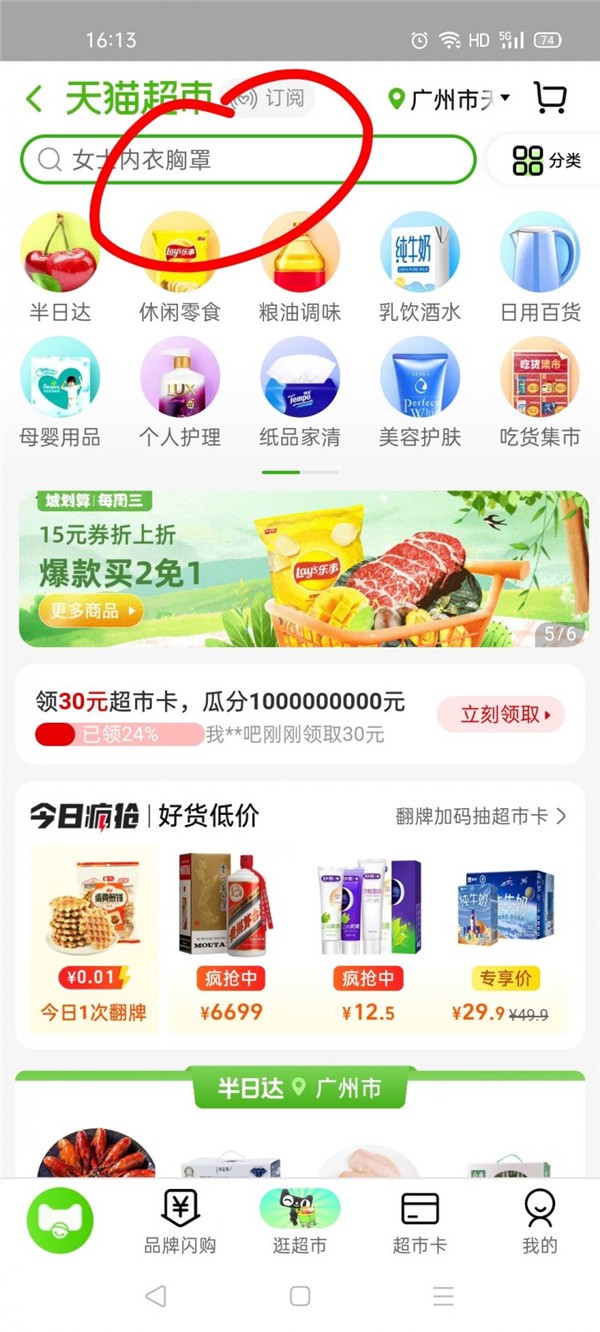 1、打开手机淘宝,在淘宝首页面找到天猫超市。然后点击进入。