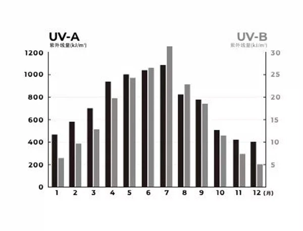 如图表所示,既使是UV-A辐射量最少的12月份,仍旧有高峰期(7月份)的3分之1左右。另一方面,就UV-B来看,在辐射量最少的12月份是高峰期(7月份)的6份之一左右。然而,3月份的辐射量是12月份的1倍以上,4月份的辐射量更达到1.5倍。因此,冬春季因气候凉爽容易疏忽大意,忘记防晒,为避免不小心晒伤,应该尽早做好防晒护理。