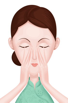 5、用中指和无名指轻轻按压睛明穴、承泣穴、瞳子髎,到太阳穴处。重复三次。