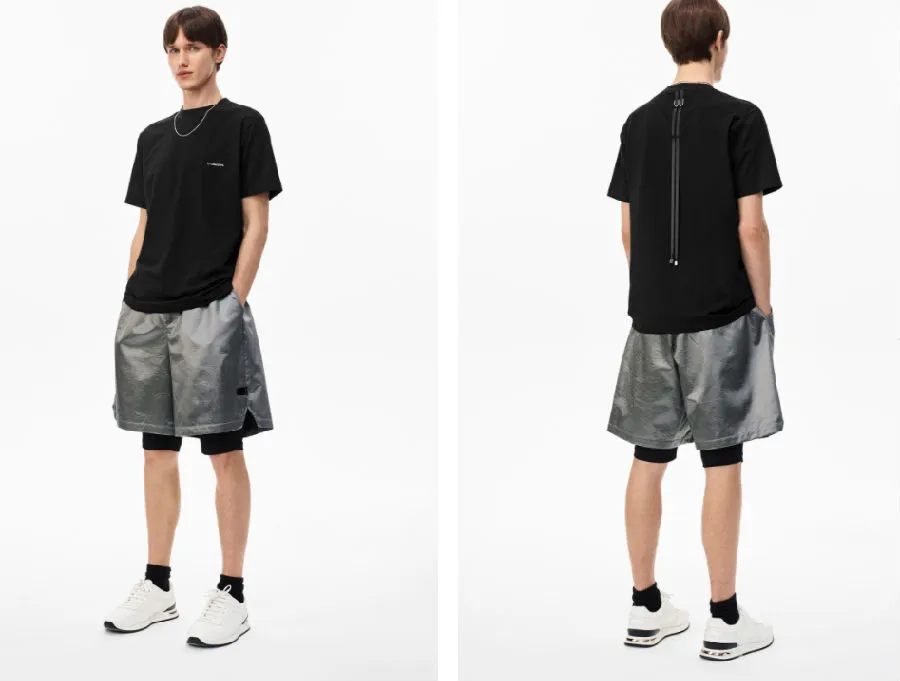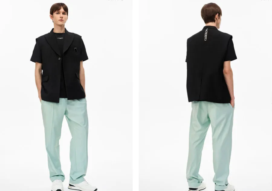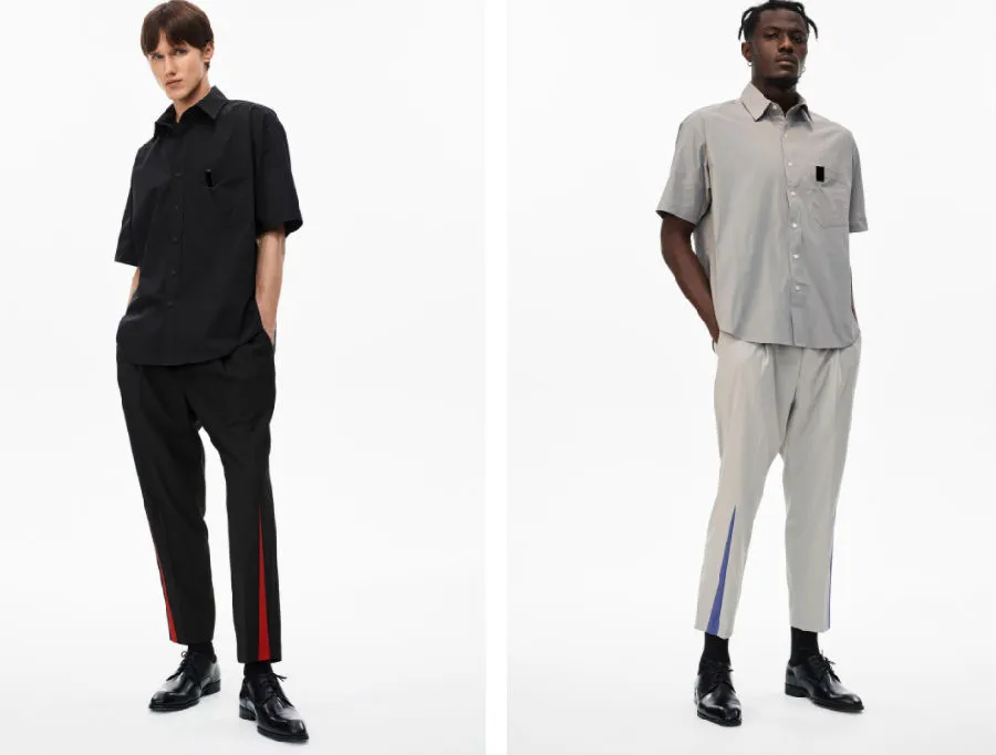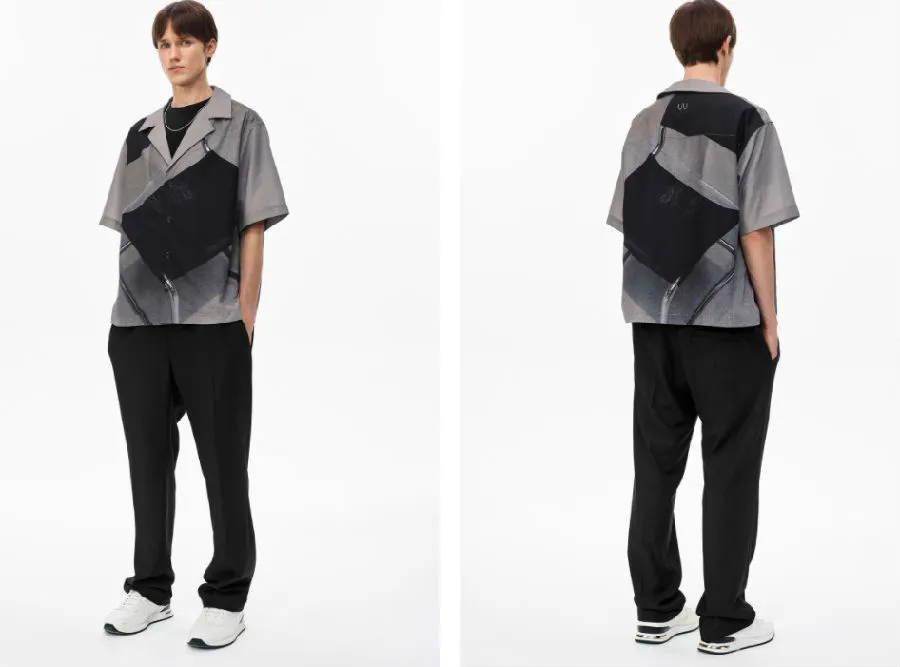 该系列依旧延续「Defect-Rebuild」主题,将产品的缺失设计带入其中,同时将动态金属配件运用 3D 渲染制作成印花图案,并运用比较绚丽的色彩增加品牌辨识度,而暗纹 Monogram 的加入更使得反光丝绸面料独具一格。不仅如此,Unawares 着重在结构拼接以及面料质感上给予简洁、大胆的创新,西裤和裁片短袖采用不可分离式结构的拼接技法,融入可调节金属扣更增加了使用者的灵活性。