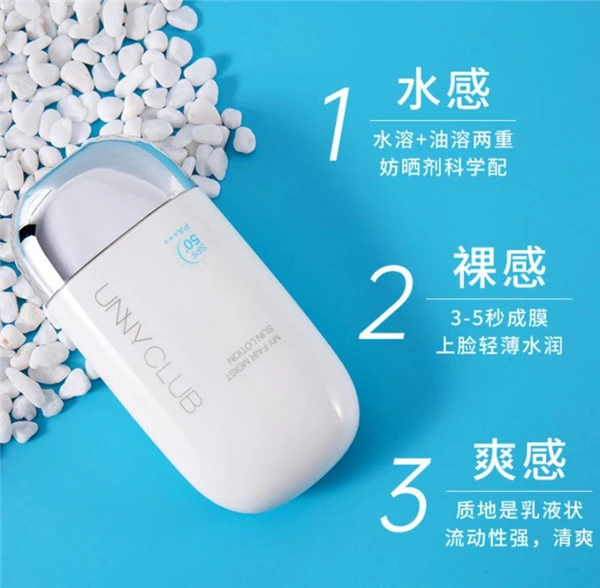 unny(全称unny club,中文名悠宜)是一个来自韩国的美妆品牌,崇尚极简天然主义,产品包装都非常简约大方,同时产品凭借着高性价比受到了许多消费者的喜爱,尤其是学生党。旗下产品中,防晒霜就是一款热销产品,属于物化结合防晒。