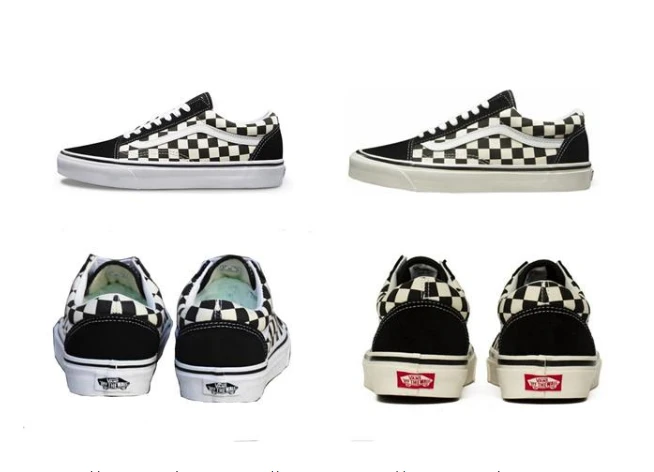 区别:最明显的,安纳海姆款为红标,白黑棋盘款为黑标,相比而言,红标更醒目更独特。其次,两款鞋的鞋面棋盘格都是略微发黄的颜色,安纳海姆款的鞋边缘用了做旧的效果,跟鞋面颜色统一;白黑棋盘的鞋边缘是纯白色,跟鞋面乳白色有一定色差。鞋型方面,安纳海姆款鞋头包胶更靠上一点,鞋头显得更窄;白黑棋盘的鞋头更宽。