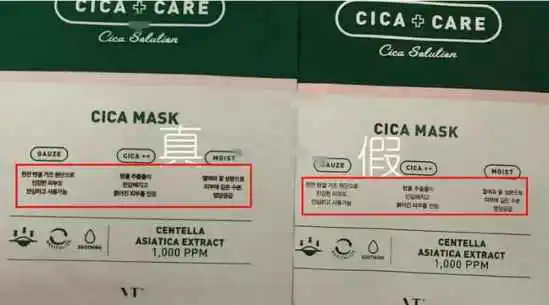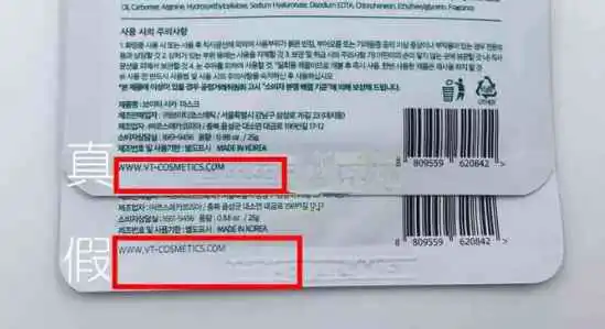 拆开过好几盒VT面膜,发现正品的网址跟保质期的压印都有部分的重叠,但是假货的则是分开的。