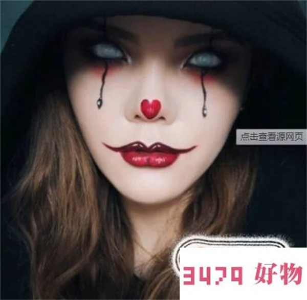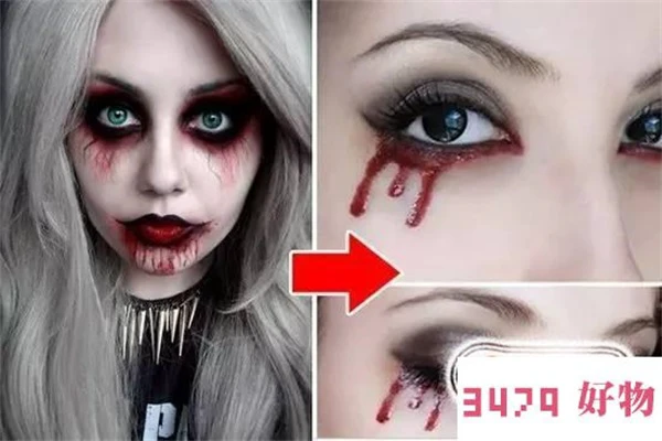 01先从简单的说起吧。毕竟手残星人还是占大多数的,有一些比较简单的妆容可以学一学。普遍万圣节妆容都是用深色眼影,黑色最为推荐,可以在眼角下面画些红色的营造流血的恐怖效果或者其他诡异的图案。想要效果更佳可以佩戴美瞳。