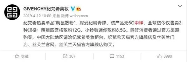 小样假货猖獗到什么程度?市面上甚至出现过品牌从未生产过的小样。因为有主播大批量销售,引得纪梵希品牌官方在2019年出来澄清:他们从未推出过小型规格(6g)的方盒散粉。