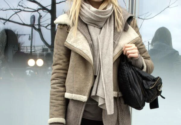 第一步 首先将围巾绕在脖子上,注意右边长度为左边的一半,并且右边在上