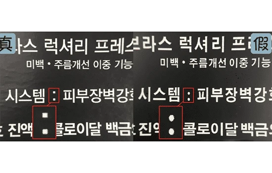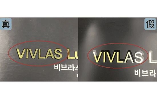 正品上的光滑字体,黑边非常细,假货黑边很大。