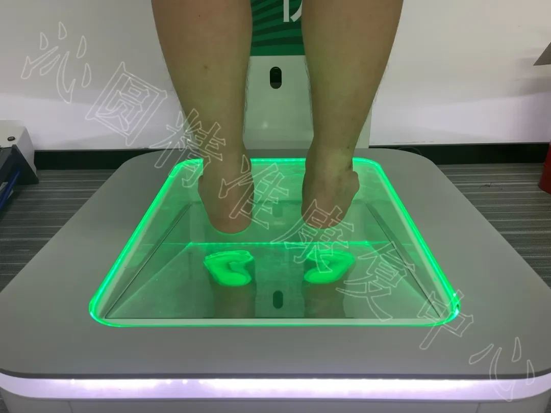 ①镜面压感测试设备:镜面压感测试是通过镜面反射的原理,可直观的观察到足底压力、足弓类型及下肢生物力线的情况。