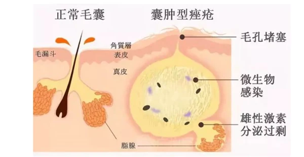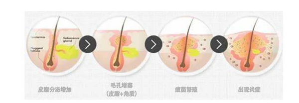 痘痘的形成大体可简述为下列过程:皮肤皮脂大量分泌,转运到表层与未脱落的老废角质结合,造成毛孔堵塞,为有害菌提供养料,激发皮肤炎性反应,最终导致痘痘出现。