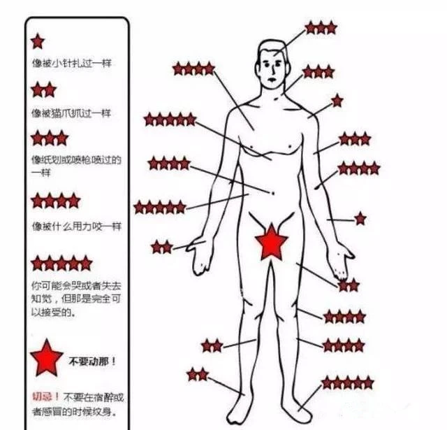 即使抹了麻药还是有一点感觉疼,麻药过后那种痛苦会比没有用麻药的感觉更强烈!最后就是综合痛的程度了,身体不同部位有不同的痛感!先说最痛的几个部位吧,首当其冲的肯定是隐私部位了所以我也最佩服那些敢在私处做文章的女性朋友,我得承认我的勇气在你们那里黯然无光啊!其次排第二的部位就是乳头附近,特别是心脏这边的。那种感觉撕心裂肺毫不夸张!