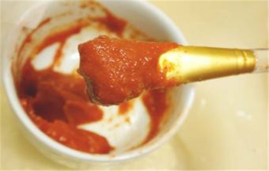 2.把刚才切好的番茄取汁,做面膜实际上就是用它的汁了,切块就是方便把番茄汁弄出来,番茄汁不需要太多。