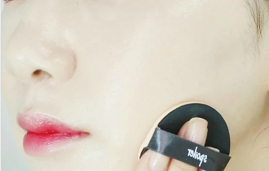 第六步:选择一款合适自己肤色的气垫粉底,轻拍全脸上妆,遮盖毛孔。