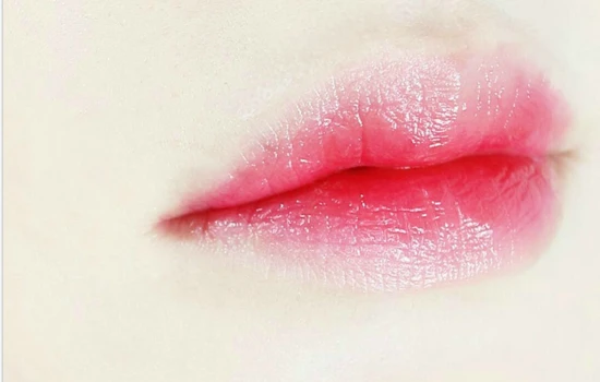 第五步:打造渐变光泽感唇妆,先用浅粉色涂在嘴唇上,再用草莓般的红色涂在唇中,自然晕开。