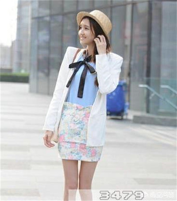 浅蓝色的小西装外套,柔美恬静的气息,展示出清新唯美魅力,简洁大方的款式,内穿白色上衣,下身穿碎花短裙,少了硬朗,多了些娇俏可人,整个装扮既淑女又很优雅!。