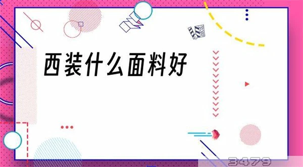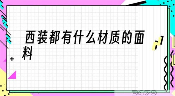 材质西装面料有聚酯纤维、羊毛面料、亚麻面料、纯棉面料、泡泡纱面料、羊毛与聚酯纤维混纺面料、羊毛与羊绒混纺面料、羊毛与亚麻混纺面料、羊毛、亚麻、真丝混纺面料;。