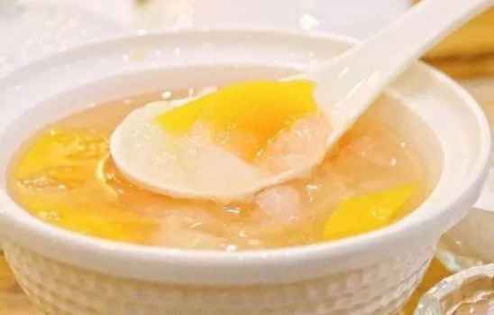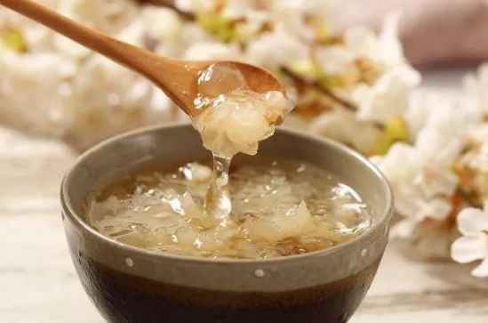 制作方法:把桂花洗净去杂质;银耳用温水发2小时,去蒂头、杂质,撕成瓣;雪蛤用温水发透,洗净并剁碎;冰 糖打碎成屑。把桂花、雪蛤、冰糖、银耳同放炖锅内,加入500毫升的水,用水煮沸,然后用文火炖煮35分钟左右,等稍微等一下就可以拿出来食用了。