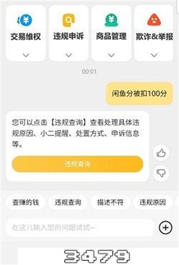 用户如果想要对扣分进行申诉,可以点击【我的】,点击【帮助与客服】,点击【在线客服】,输入【闲鱼分被扣100分】,然后点击【违规查询】查看违规详情(违规原因、处罚信息、是否可进行申诉等)。如有申诉需要,建议用户及时按照规则发起申诉,若是成功申诉,则账号能正常使用,若申诉不成功,那账号就不能使用了。