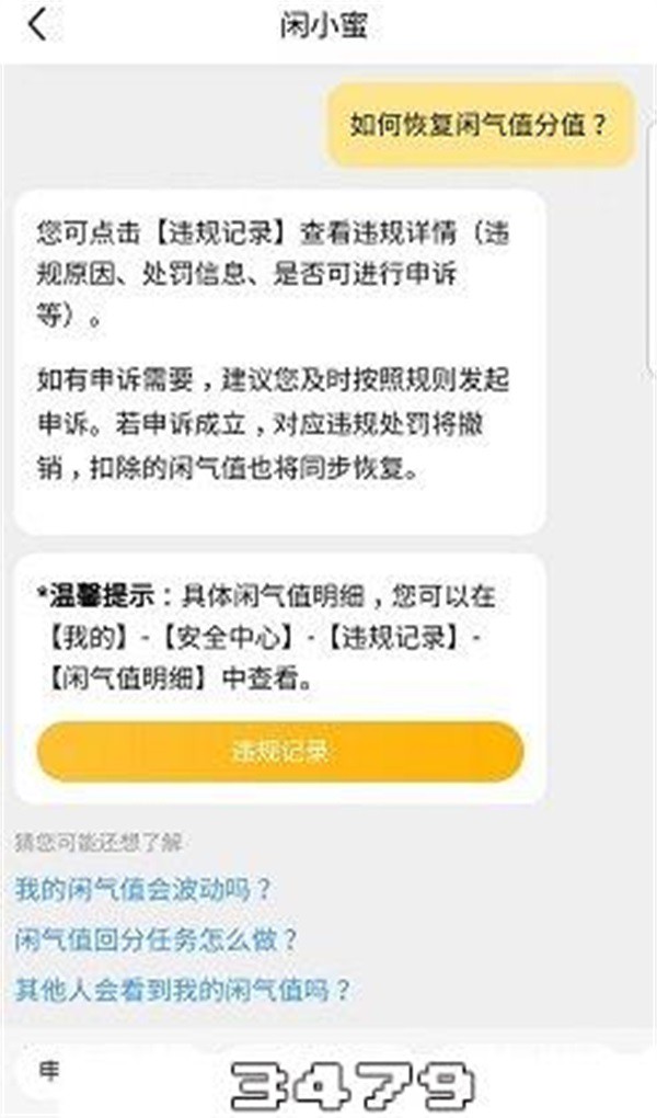 用户还可以可点击【违规记录】查看违规详情,如果对扣分有异议,可以按照【违规记录】内违规详情的申诉要求和流程进行申诉。若申诉成立,对应违规处罚将撤销,扣除的闲气值也将同步恢复。