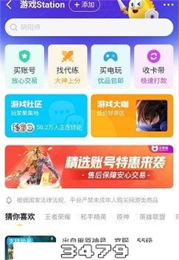 在闲鱼平台有专门的游戏频道,用户登录闲鱼APP,搜索游戏,点击搜索页最上面的【闲鱼游戏频道】,频道的相关标示也已经标明未成年人严禁购买网游类商品,点击【买账号】,进入【买账号】这个页面可以看到很多网游商品,买家可以根据自己的需求购买,此交易将由闲鱼旗下的交易猫监管。