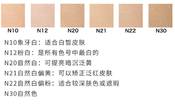 香奈儿果冻气垫色号国内上市款总共有6个,六个色号中最白的是N10象牙白色,N12是偏粉调的白皙色,其余的颜色都是接近肤色的色号,对于亚洲妹子来说白皙色号和肤色色号根据喜好和自己肤色选择即可。