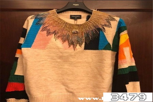 首先我们看一下图片上的这款拼色双色毛衣。这款毛衣的价格是18000元人民币。这是一款香奈儿水钻式羊绒毛衣,整个毛衣都是100%羊绒的,并且领子周围的小花边全部都是用水钻镶上去的,看起来非常的大气,也非常的闪。另外,这款毛衣是有好几种颜色拼色组成的,一点也不违合,倒显得非常有气质。这款衣服的复杂工艺从图片上就可以看出来。
